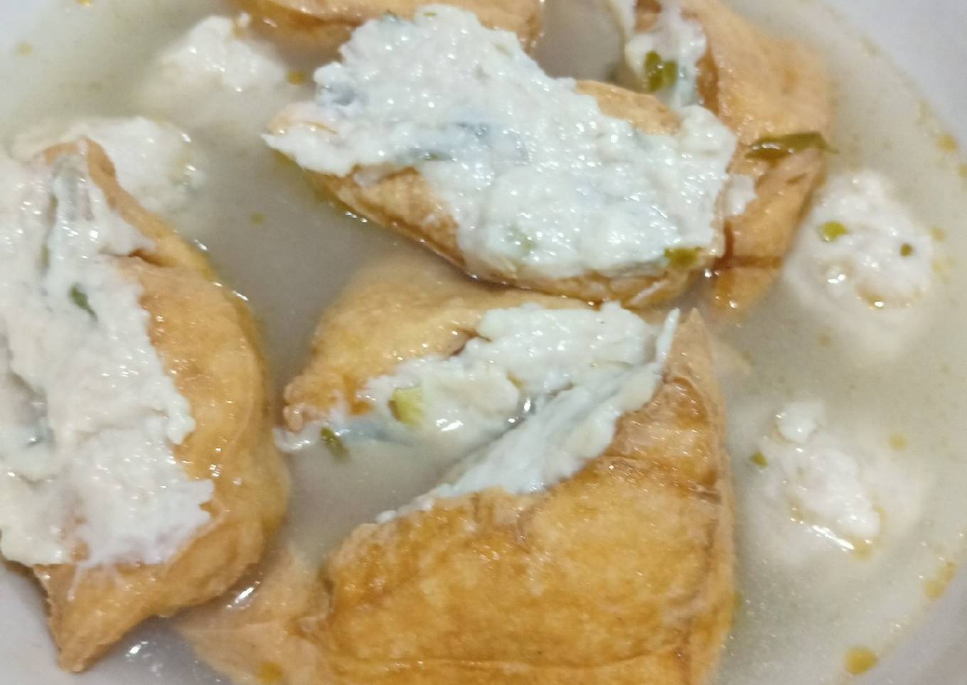 - Masukkan tahu yang sudah diisi ke dalam didihan air. Beri garam, kaldu jamur dan merica bubuk. Cicipi rasa. Masukkan daun bawang,masak sebentar. Matikan kompor dan sajikan🙂