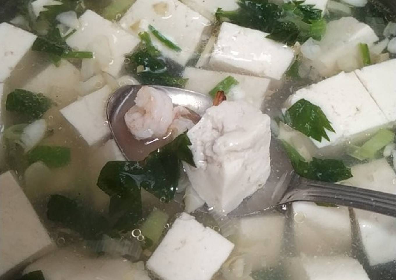 - Tumis bawang putih hingga harum, masukkan air. Kemudian masukkan tahu & udang. Tunggu hingga mendidih