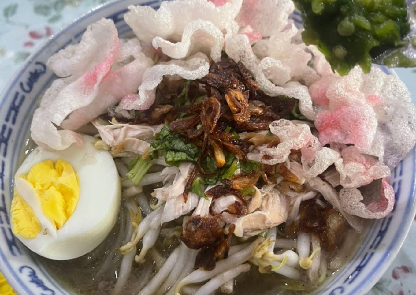 Misop medan cuma pk krupuk kanji , toge, mie kuning / bihun, ayam goreng, seledri dan bawang goreng