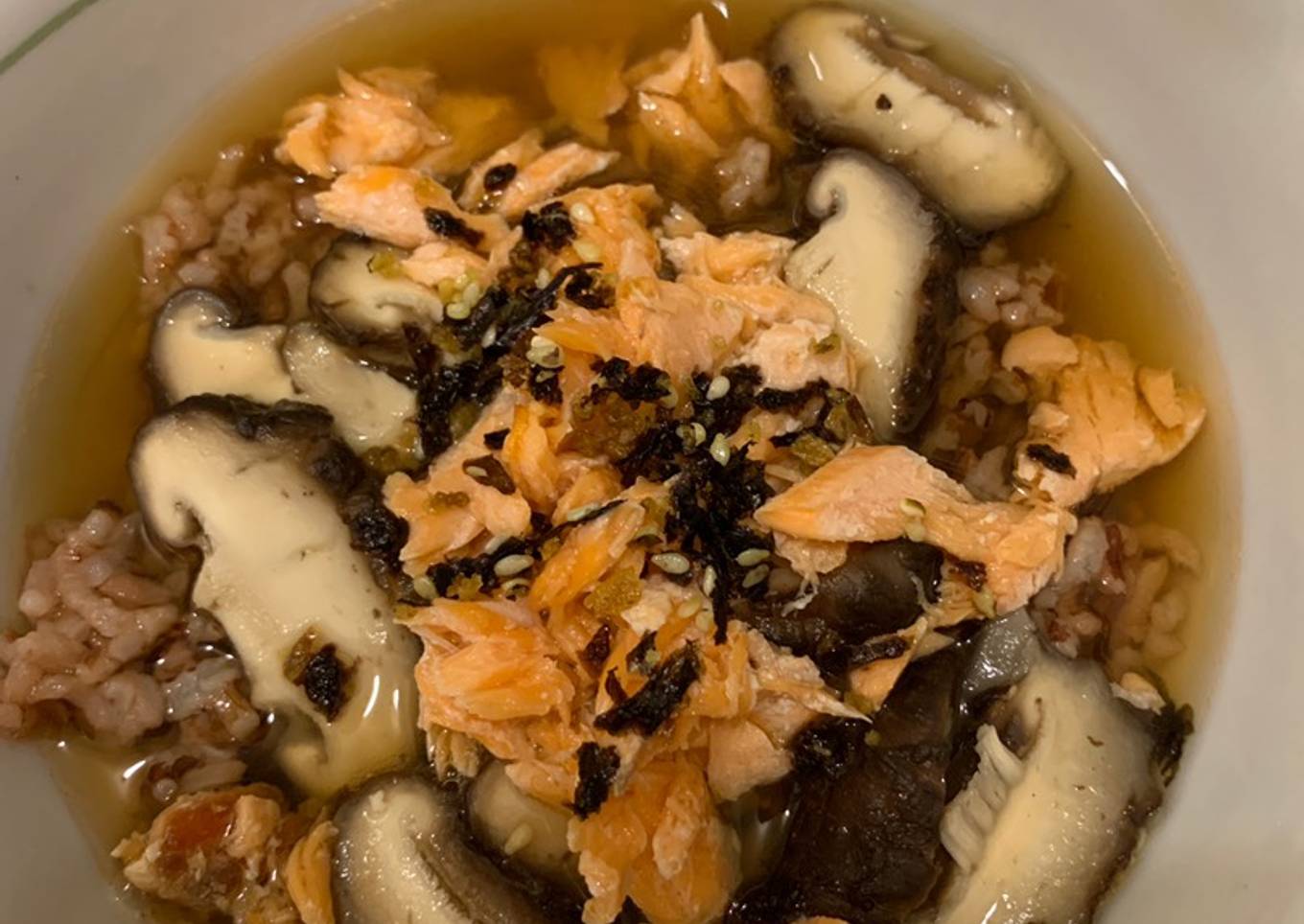 - Susun nasi, salmon, & jamur di mangkuk. Kemudian siram dengan kuah dashi.
