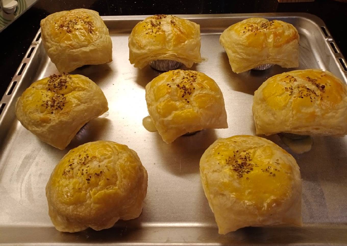 - Olesi puff pastry dengan kuning telur, taburi keju/oregano