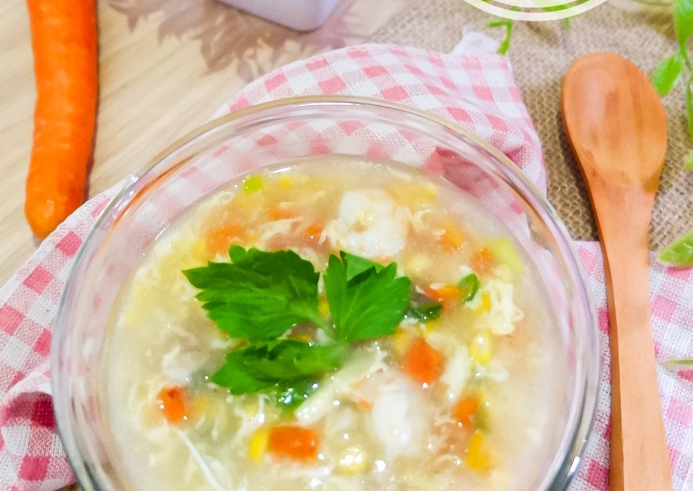 - Setelah itu masukkan ayam Suir dan rebusan udang, aduk rata. Tambahkan telur yang sudah dikocok lepas tadi, masukkan perlahan sambil terus diaduk. Tambahkan larutan maizena dan daun bawang. Koreksi rasa dan teksturnya