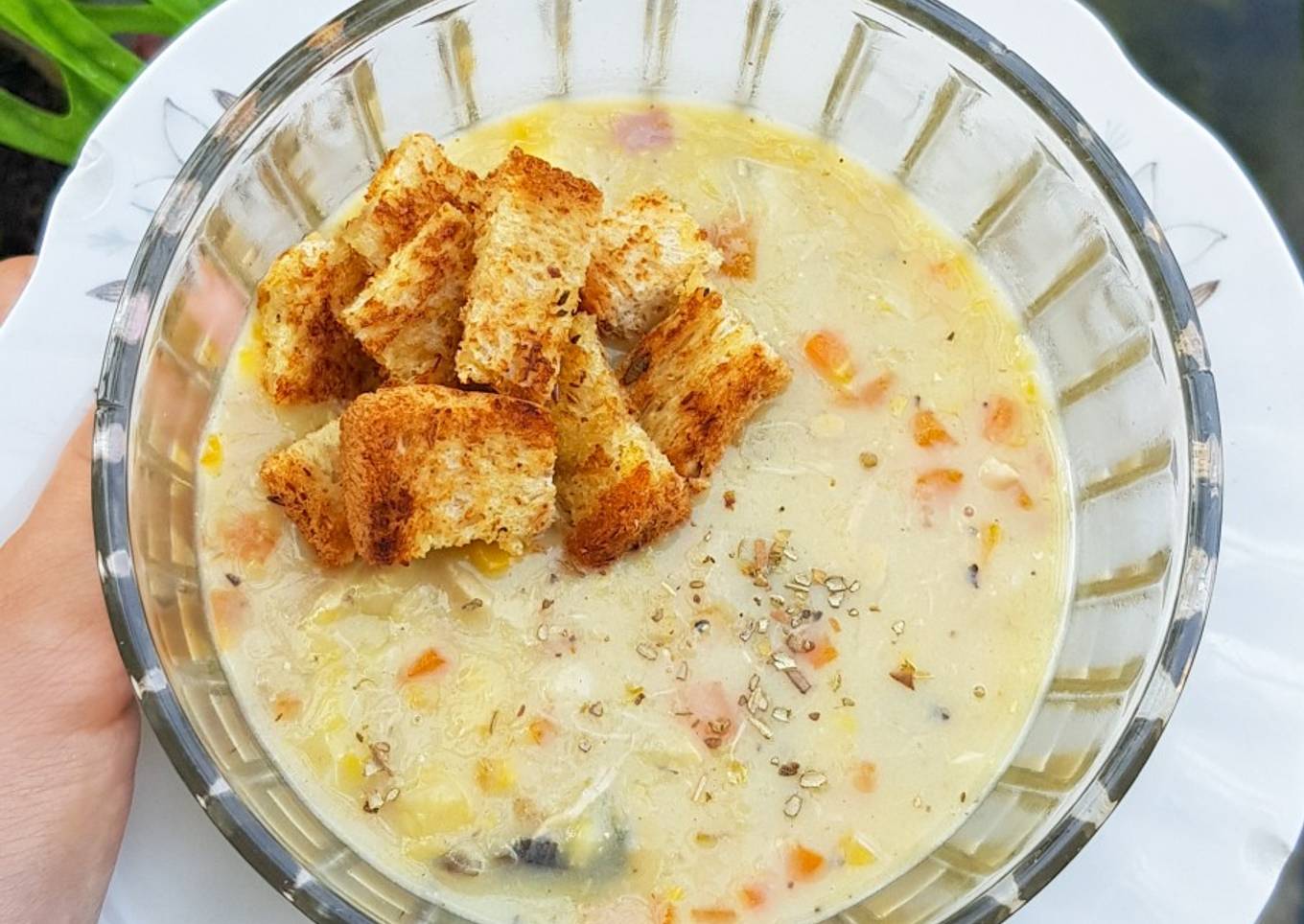 - Tumis bawang bombai dan bawang putih dengan mentega sampai harum. Lalu masukkan dlm kuah kaldu. Masukkan semua bahan2 lain (wortel, jamur, daging ayam suwir, jagung manis serut. Tambahkan susu uht cair, bumbui dgn oregano, garam, lada, pala, gula pasir, penyedap. Jika perlu kentalkan dengan terigu yg dilarutkan dg air. Jika dirasa kurang kental, bisa ditambah larutan terigunya sesuai selera.