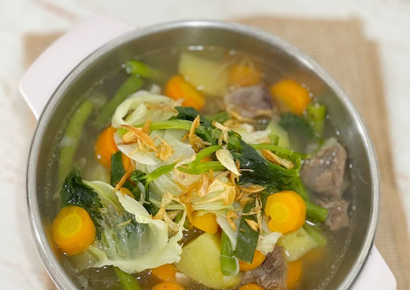 - Setelah itu masukan sisa sayuran & seledri. Lalu masukkan tumisan bawang merah & daun bawang. Tambahkan garam, penyedap sapi, & merica. Aduk rata. Tes rasa. Setelah semua sayuran matang, sop siap disajikan dengan taburan bawang goreng.