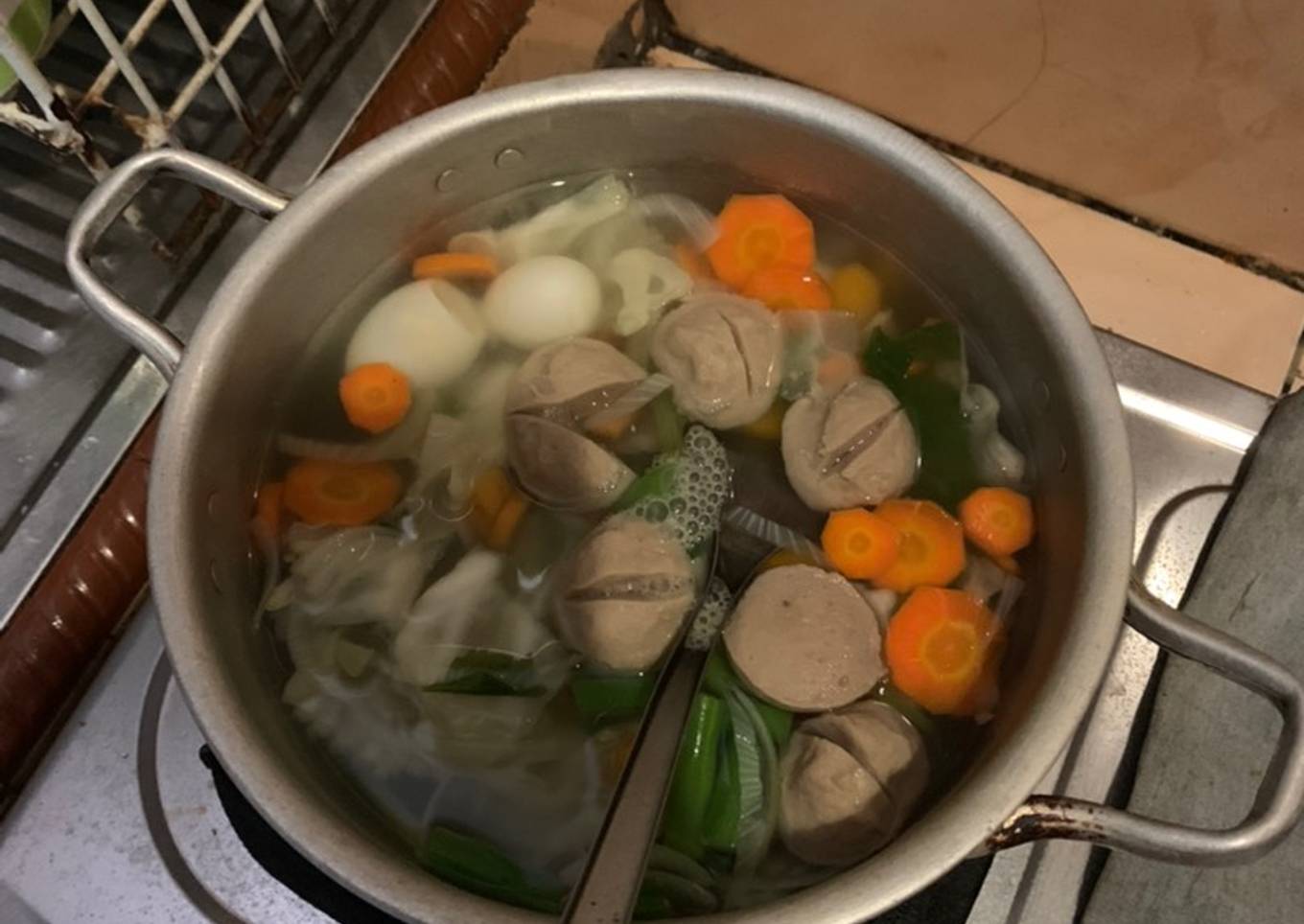 - Didihkan air, masukkan bawang bombay dan bawang putih geprek, seledri, dan juga wortel