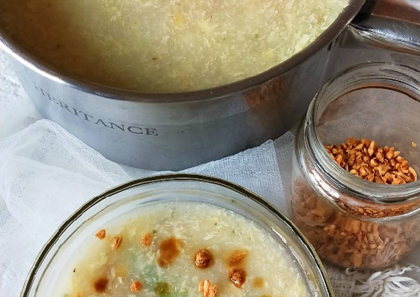 - Sesudah mengental, tuang telur sambil diaduk cepat. Beri bumbu. Tes rasa