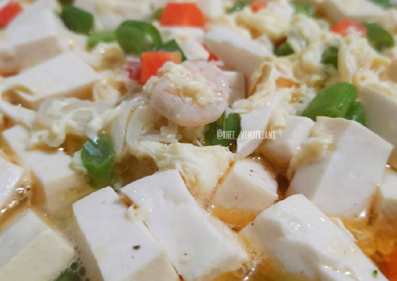 - Tumis baput hingga harum lalu masukan udang, masak hingga berubah warna, tambahkan saos sambal dan air, aduk rata, masak hingga mendidih, tuang telor, aduk2 cepat, masukan sayuran dan tofu juga bumbu2, aduk rata, masak hingga matang, angkat dan sajikan