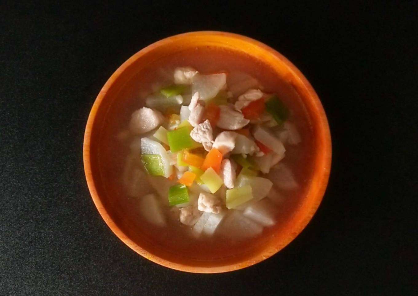 - Panaskan minyak tumis bawang. Masukan irisan ayam tunggu setengah matang lalu masukan air dan irisan lobak. Tambahkan garam, lada, kaldu jamur aduk dan masak sampai mendidih
