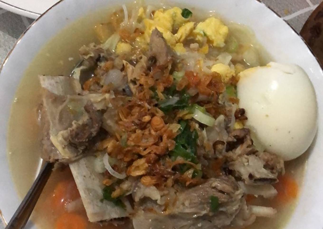 - Jika ingin di sajikan, tata di mangkuk saji wortel, kentang, kol, bihun, daun bawang, seledri. Lalu tuang sop iga di mangkuk, tambahkan bawang goreng, dan sajikan👍