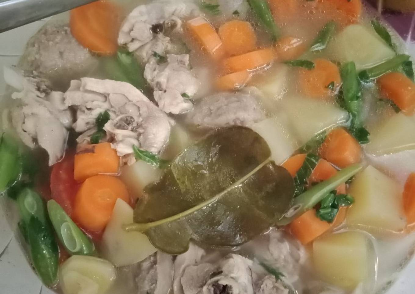 - Rebus bahan kuah hingga ayam matang, ketika setengah matang masukkan sayuran dan bakso