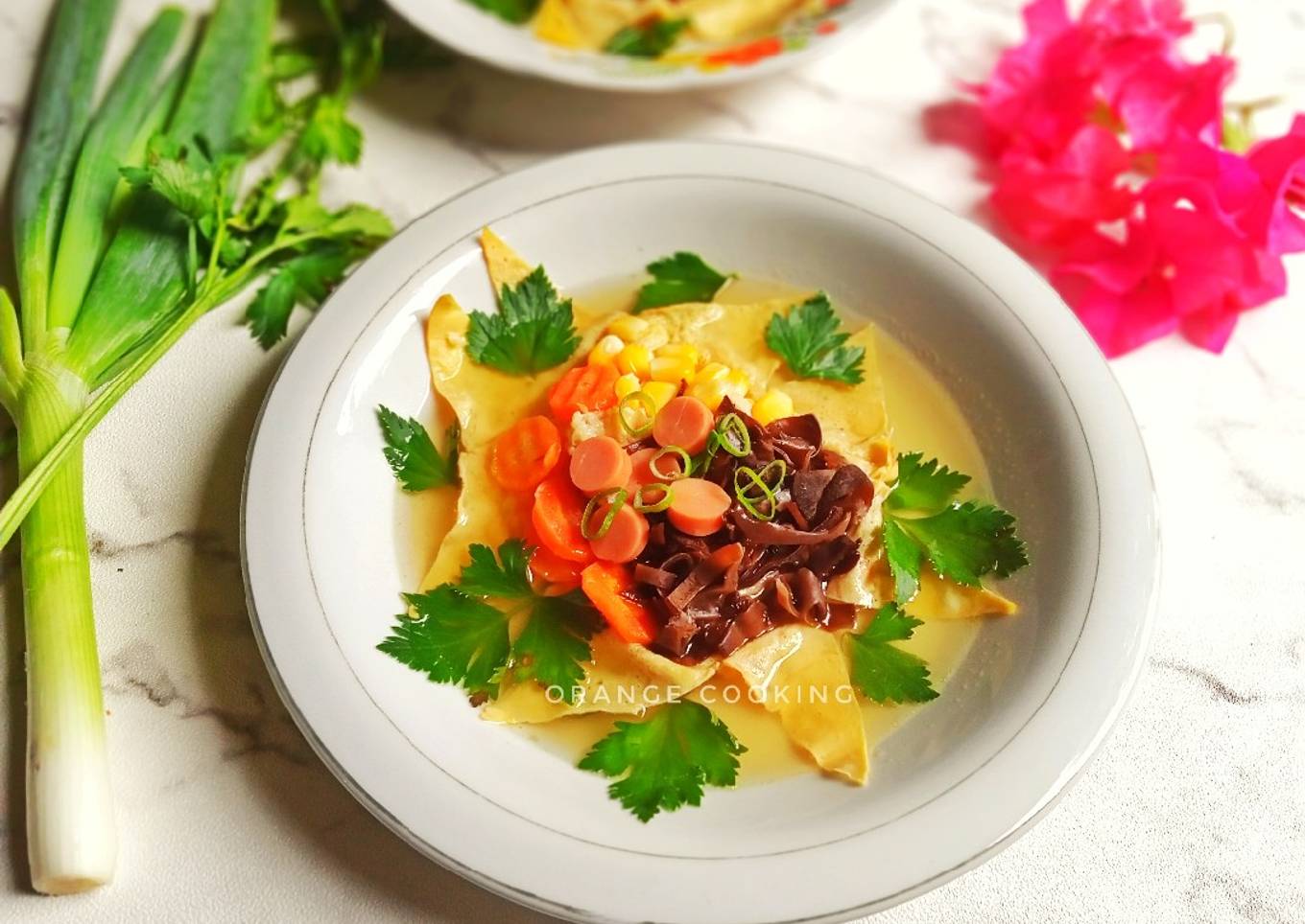 - Potong dadar kukus bentuk diagonal menyerupai matahari. Garnis dengan daun bawang dan seledri. Tuangi kuah kaldu. Sajikan hangat.
