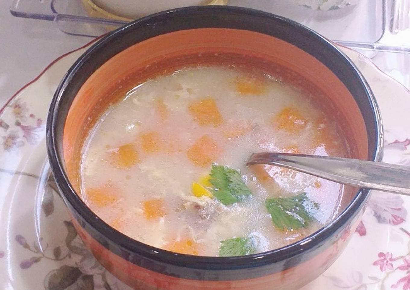 Di bulan ketiga kehamilanku,aku belum bisa makan nasi dengan lahap.Untuk menambal kekurangan karbohidrat aku masak sup jagung dengan tambahan kentang yang kaya karbohidrat.Mengingat berat badan yang semakin turun,aku berfikir kalau aku perlu tambahan karbohirat untuk tubuhku.Sup ini dilengkapi pula dengan susu dan telur sebagai sumber protein hewani.Dan ada wortel yang mengandung vit A.