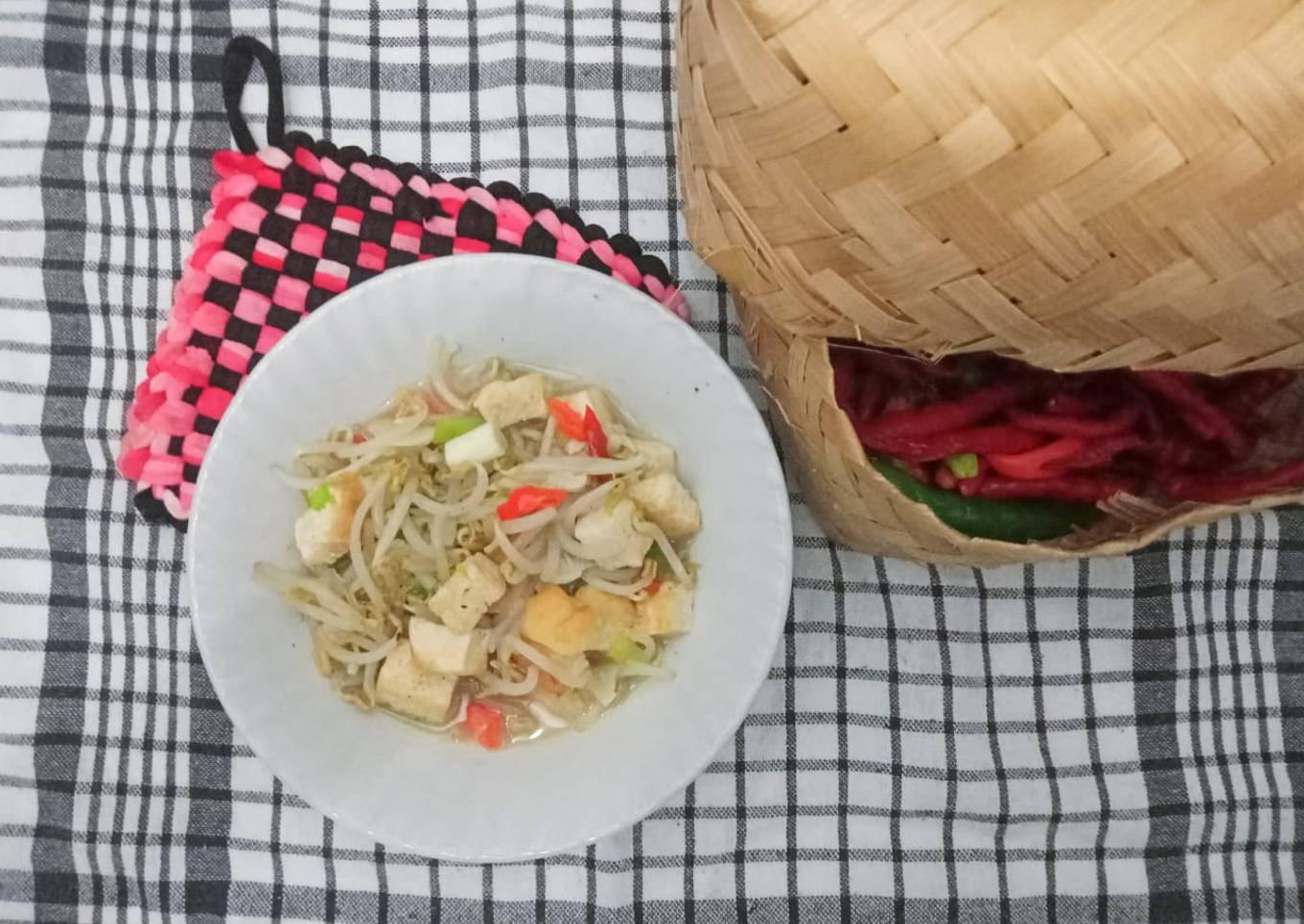 - Panaskan minyak, tumis bawang putih, bawang merah dan cabe. Kemudian masukan toge dan beri air lalu tambahkan tahu yang sudah di goreng sebelumnya. Masukan garam, gula dan kaldu bubuk, cek rasa
