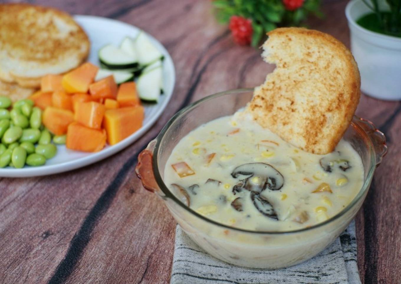 - Tuang tepung terigu yang telah dilarutkan ke dalam 70ml air. Aduk hingga mengental, angkat, sajikan. Enak sekali dinikmati dengan garlic bread. Namun karena tidak ada jadi saya ganti dengan toast/roti tawar yang saya panggang di atas teflon. Selamat mencoba.