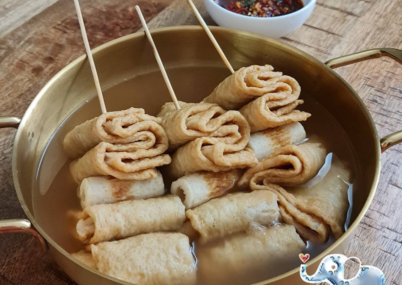 - Cuci fish cake di air mengalir, lalu keringkan. Tusuk dg tusuk sate.