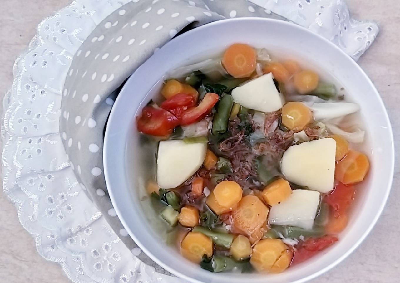 Banyak hal yang sedikit banyak mempengaruhi kualitas rasa dari Sayur Sop bening, pertama dari jenis bahan, kemudian pemilihan bahan segar, sampai cara membuat dan menghidangkannya. Tak perlu pusing kalau ingin menyiapkan Sayur Sop bening enak di rumah, karena asal sudah tahu triknya maka hidangan ini dapat menjadi suguhan spesial. Seterusnya adalah gambar berkaitan dengan Sayur Sop bening yang bisa Anda jadikan ide.