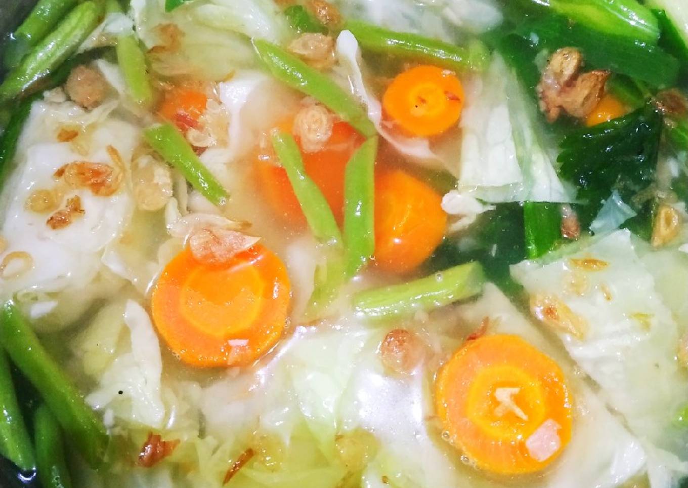 - Kemudian masukan buncis, wortel, daun bawang, seledri, kaldu ayam bubuk dan garam. Koreksi rasa. Setelah matang taburkan bawang goreng.