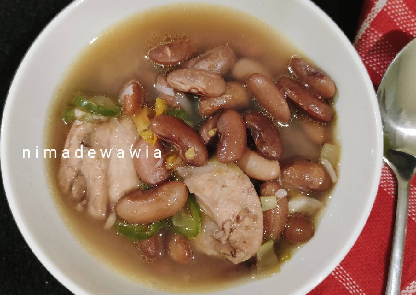 - Didihkan air, rebus ayam dan kacang hingga setengah matang. Setelah itu masukkan bahan-bahan lainnya. Masak hingga matang dan koreksi rasa sesuai selera.