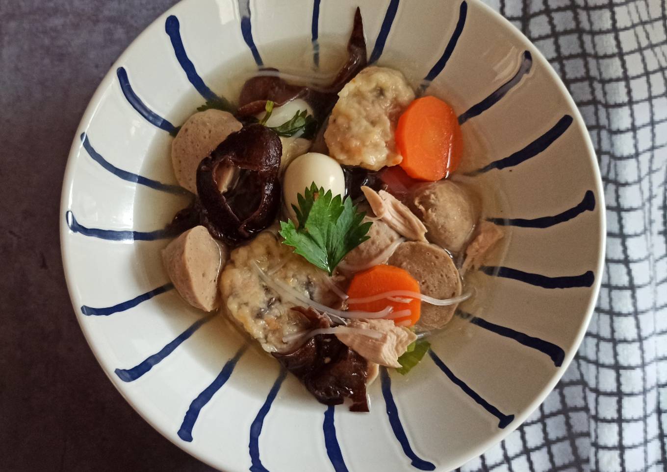 - Masukkan wortel, bakso jamur kuping, seledri dan telur puyuh. Masak hingga semua matang. Terakhir masukkan bihun, suwiran ayam dan daun bawang.