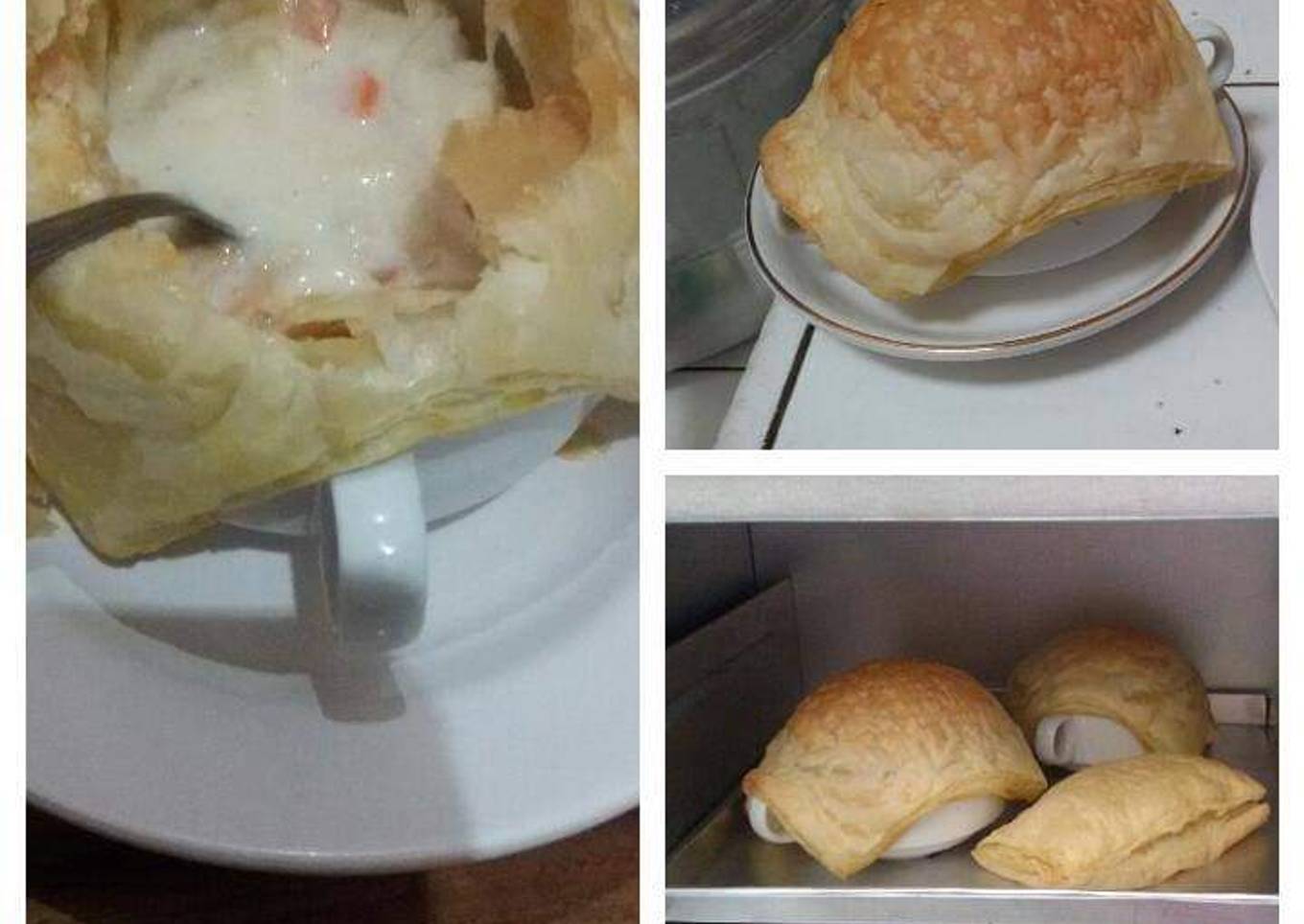 - Taruh pastry diatas cangkir anti panas yg sdh disiapkan dan sdh di isi dgn soup yg sdh matang td. Isi cangkir 3/4 sj jgn sampai penuh.