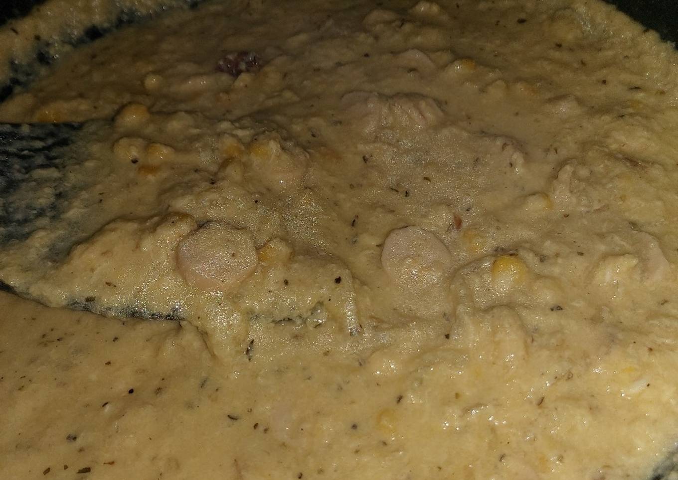 - Tumis bawang bombay, pala, lada, italian herbs hingga harum dan layu. Masukkan sosis lalu tumis hingga berubah warna kecoklatan. Masukkan bahan blender (jagung + bawang putih). Aduk rata. Masukkan susu dan air panas. Setelah mendidih, masukkan 50 gram jagung pipil. Setelah jagung empuk, masukkan telur kocok. Aduk cepat. Masukkan kaldu ayam, garam, dan gula. Tes rasa. Matikan kompor.