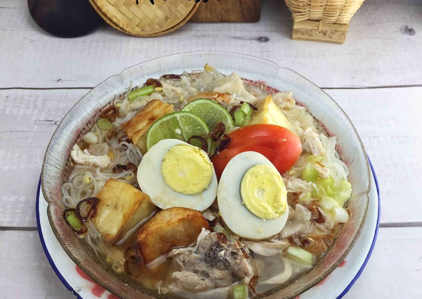 - Secukupnya bawang goreng, daun bawang dan jeruk nipis