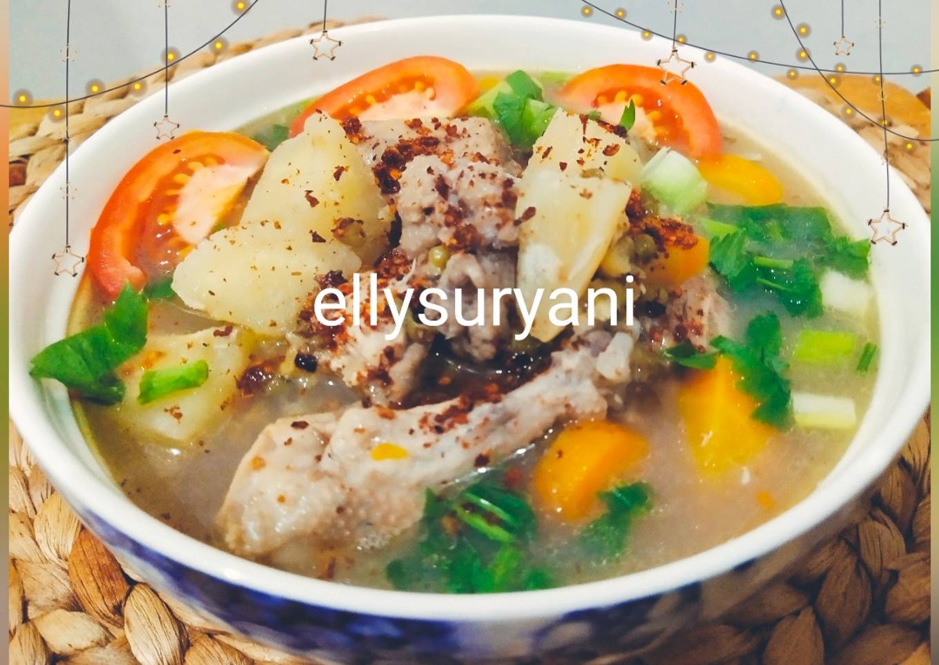 - Tinggal disajikan ke mangkuk, beri potongan tomat, daun bawang dan daun sledri. Boleh kucuri jeruk kunci. Taburi dengan bawang goreng dan chili flake, mantap banget. Selamat mencoba