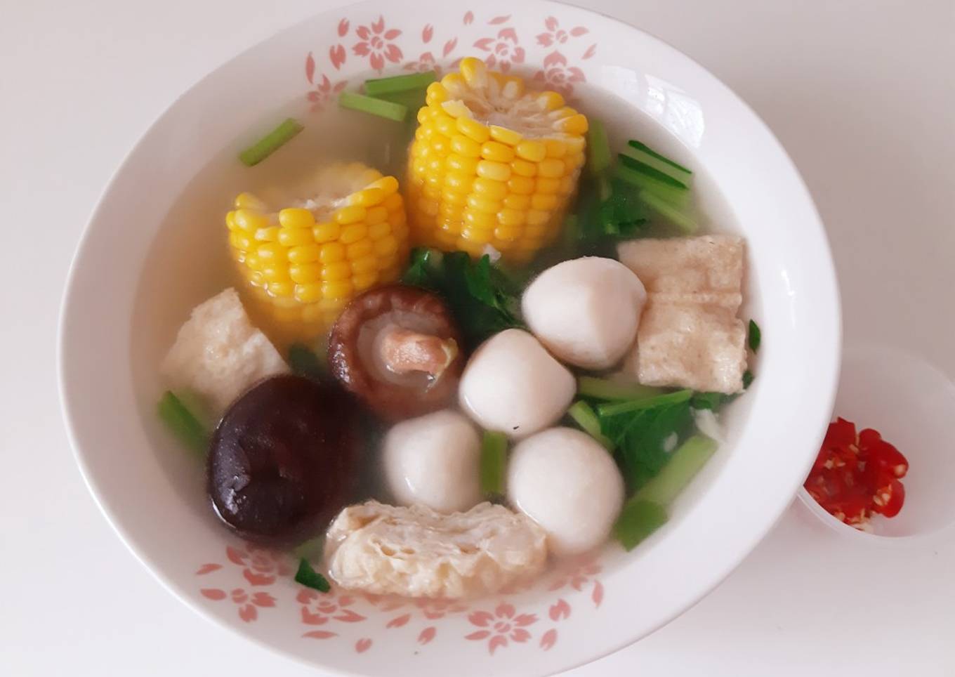 - Didihkan kuah, masuk jagung, jamur, fish ball, tau kee, sawi ijo.. jadi deh..