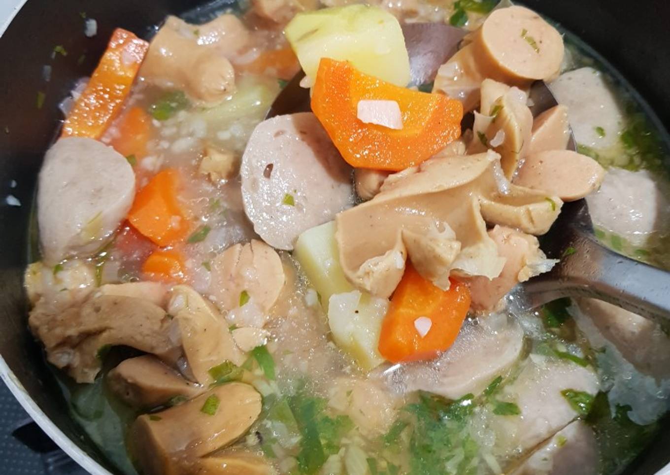 - Didihkan air masukan kentang dan wortel setelah setengah matang masukan bakso dan sosis