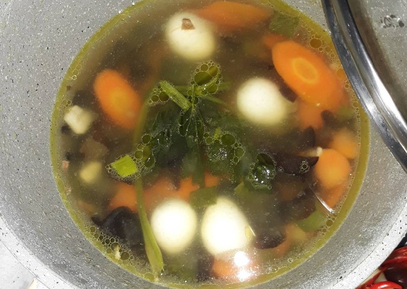 Banyak hal yang sedikit banyak berpengaruh terhadap kualitas rasa dari Sup telur puyuh, pertama dari jenis bahan, kemudian pemilihan bahan segar, sampai cara membuat dan menyajikannya. Tak perlu pusing kalau ingin menyiapkan Sup telur puyuh enak di rumah, karena asal sudah tahu triknya maka hidangan ini dapat menjadi sajian spesial. Next adalah gambar mengenai Sup telur puyuh yang bisa kamu jadikan contoh.
