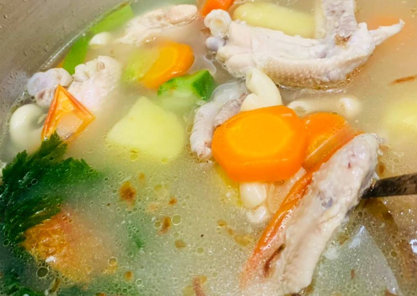 - Jika ayam sudah matang, masukkan potongan kentang. Kemudian masukkan potongan wortel. Jika ketiganya sudah empuk masukkan potongan gambas, bakso, dan makaroni. Selanjutnya masukkan daun bawang, tomat, dan seledri ikat