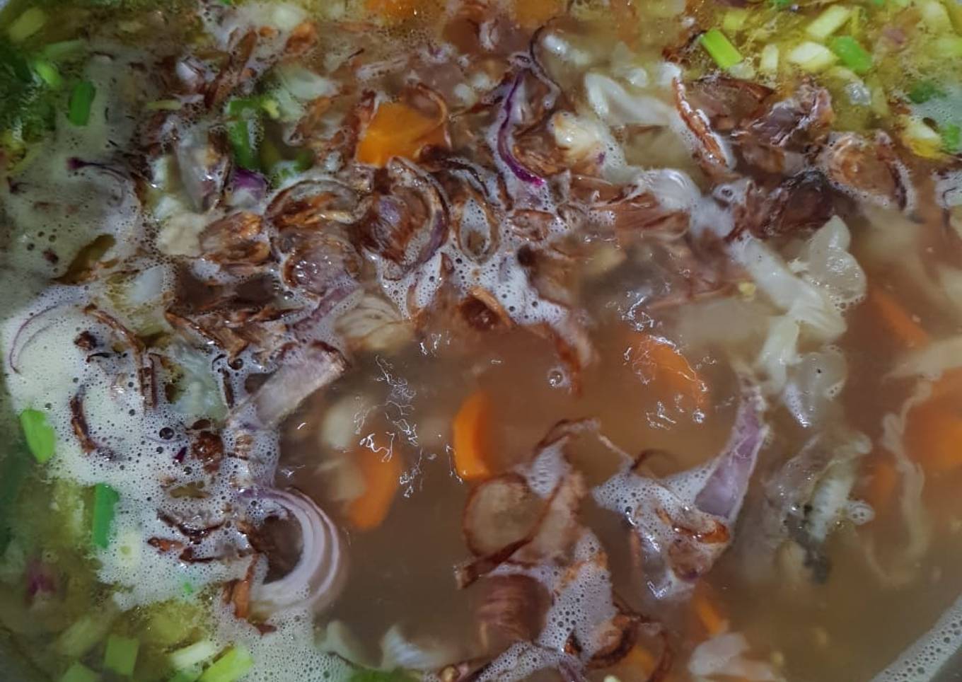 - Lalu masukan air hingga mendidih, masukan tulang, tnggu mendidih, lalu masukan sayuran. Lalu tambah garam dan (kaldu sapi sesuai selera).