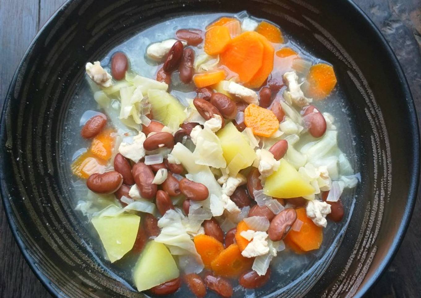 - Tambahkan wortel, kol, kentang dan kacang merah. Tunggu hingga matang.