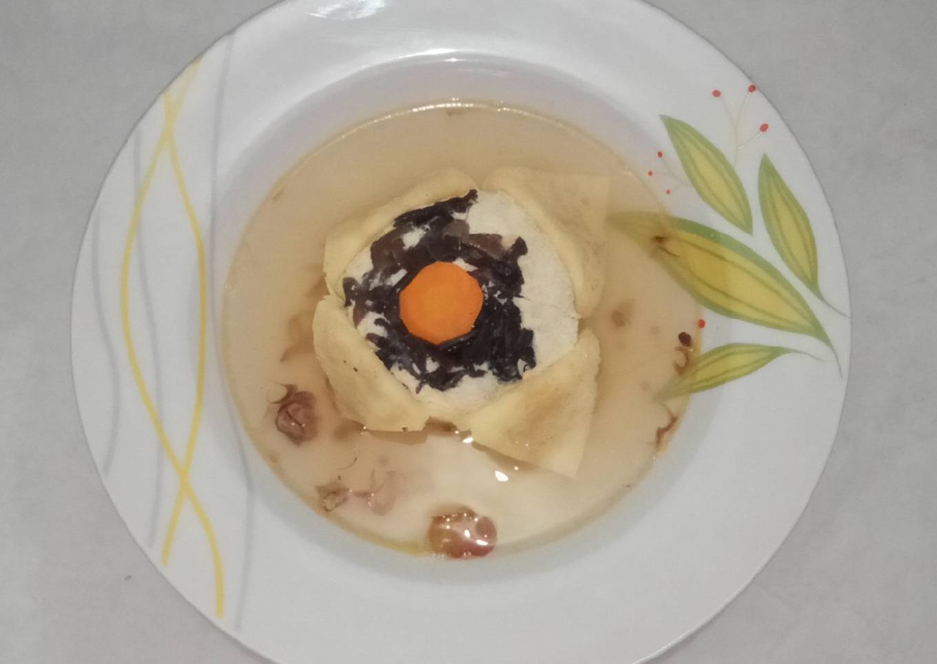 Rebus air hingga mendidih. Sembari menunggu air mendidih, haluskan bawang putih, pala dan merica kemudian tumis dengan margarin hingga harum. Masukkan bumbu yang ditumis ke dalam air mendidih. Tambahkan pala dan daun bawang. Masak hingga matang - Potong isian sup dan buka agar berbentuk seperti matahari, tata dalam wadah, bubuh kuah, taburkan brambang goreng dan sajikan.