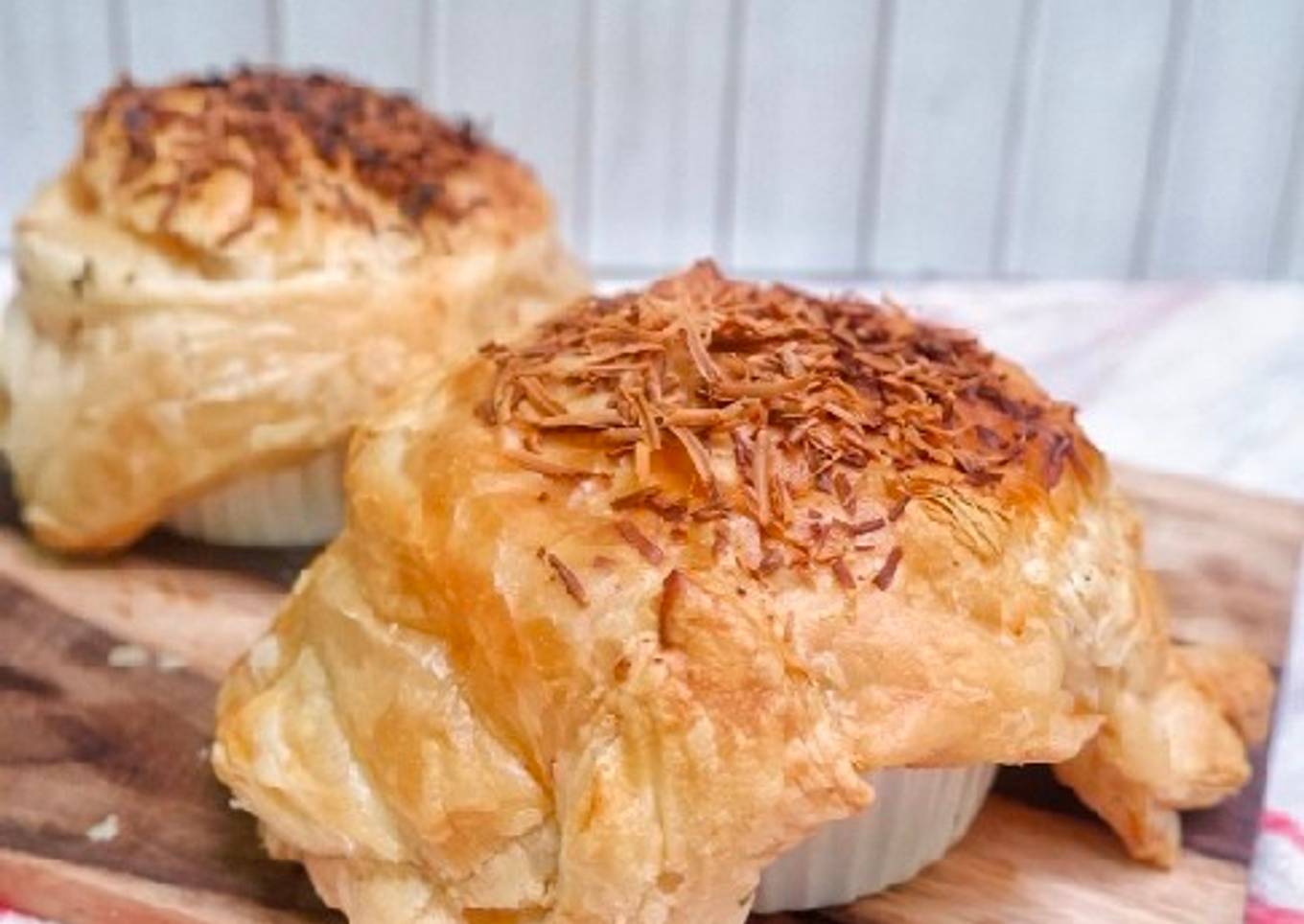 - Siapkan bahan olesan. Siapkan kulit pastry ukur melebihi wadah soup. Letakkan diatas wadah soup. Taburi keju diatasnya.