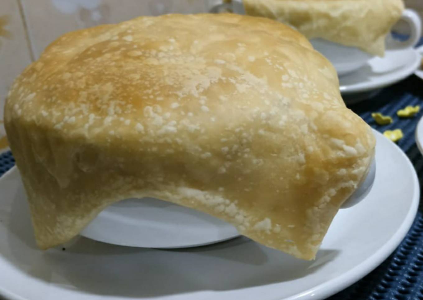 - Tuang kedalam ramekin / mangkuk sup tahan panas atau bisa juga wadah alumunium foil. Tutup dengan lembaran puff pastry