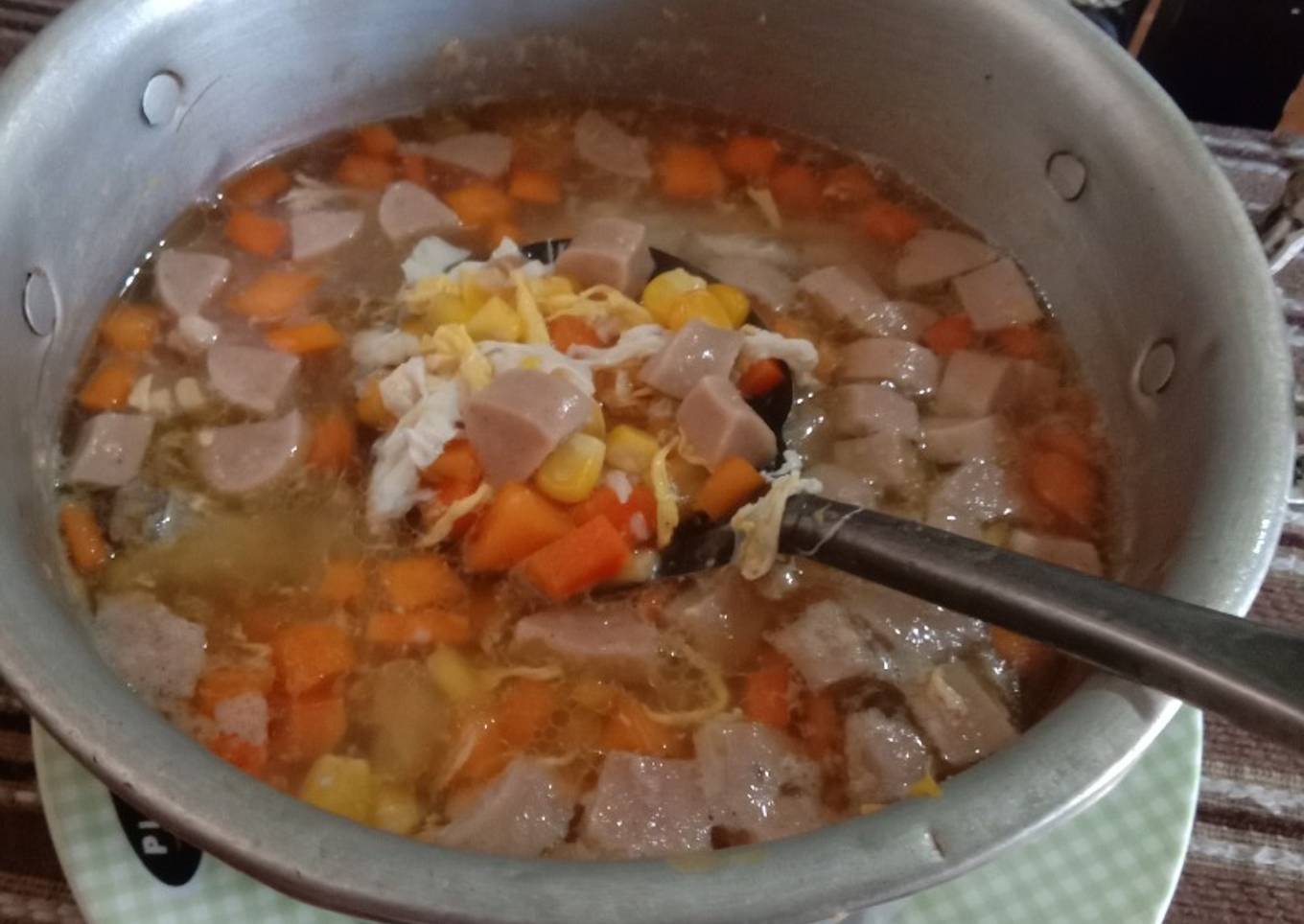- Masukkan secara bertahap, telor, jagung manis, wortel, sosis. Tambahkan garam dan penyedap rasa sesuai selera. Koreksi rasa.