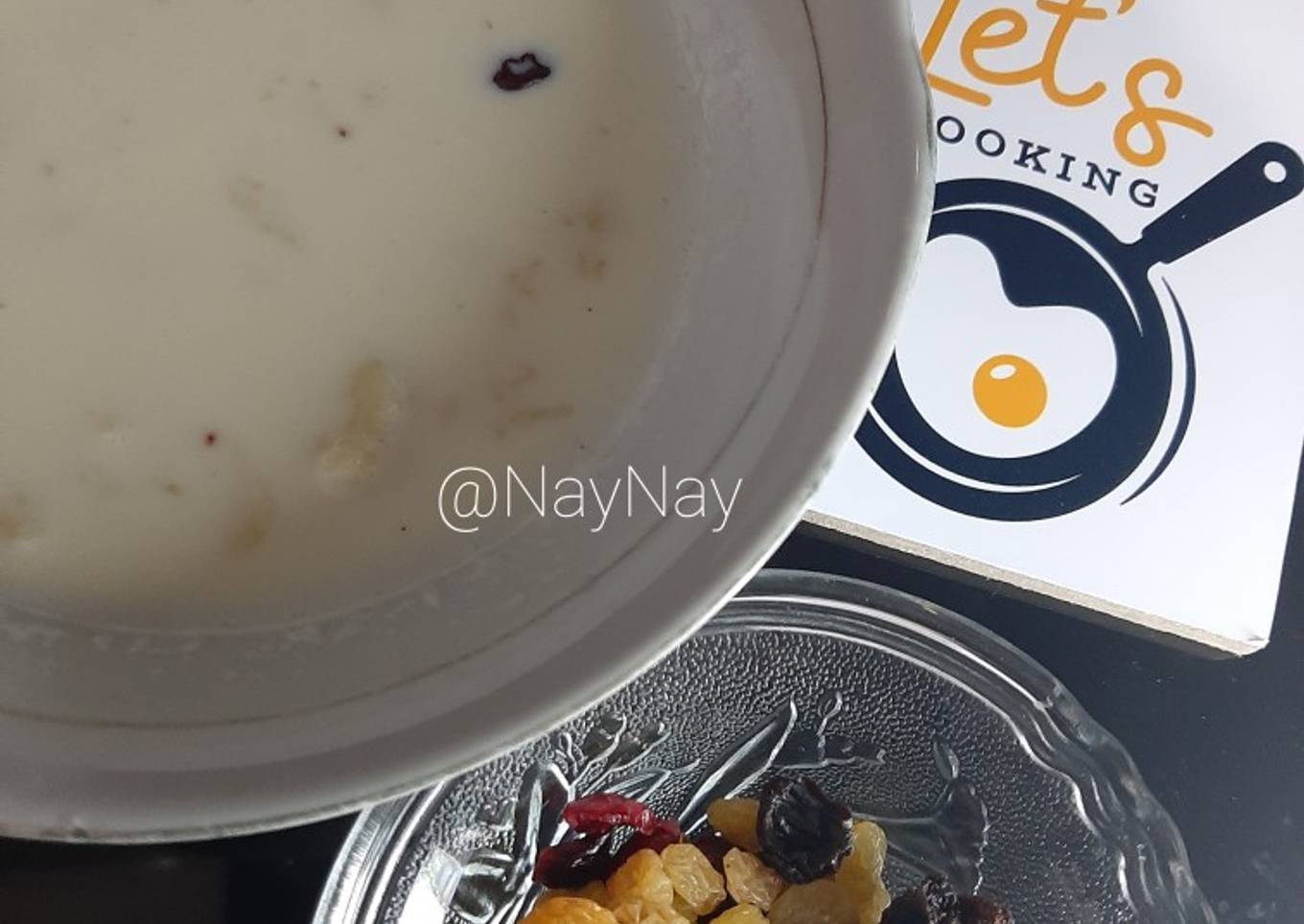 - Tuang air hangat.Tambahkan mix berry dan kismis.