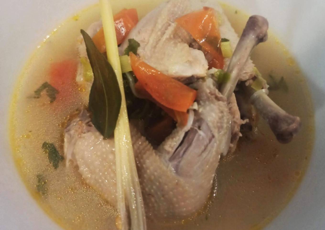 - Masukkan bumbu dlm rebusan ayam. Masak sampai bumbu terserap. Tambahkan bw daun seledri Dan tomat.