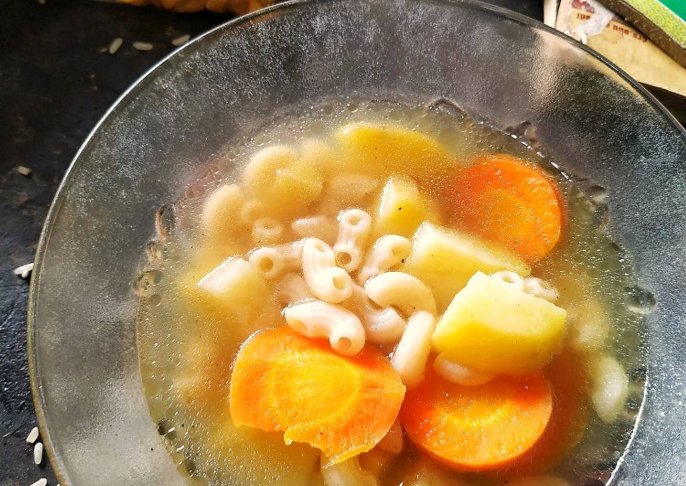 - Rebus air dan minyak sampai mendidih, masukkan wortel dan kentang. Rebus hingga matang, masukkan bumbu racik sup dan makaroni yang sudah direbus. Aduk rata, beri lada bubuk biarkan hingga mendidih.