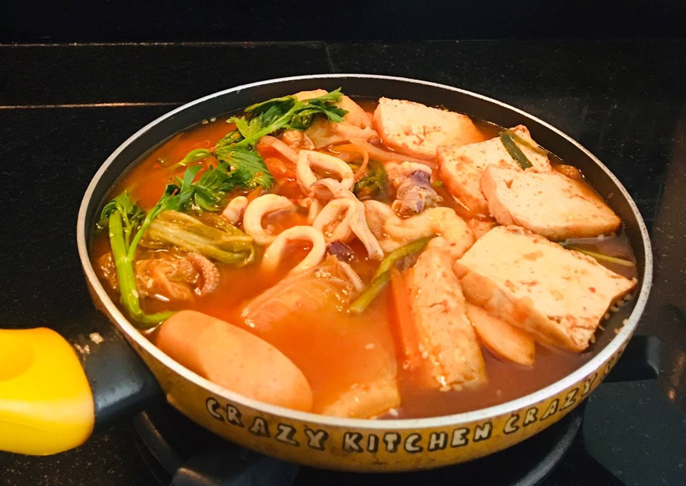 - Didihkan air dan masukan gochujang,lalu masukan tahu,sawi,kimci dan sosis,tambahkan kaldu bubuk dan kecap ikan