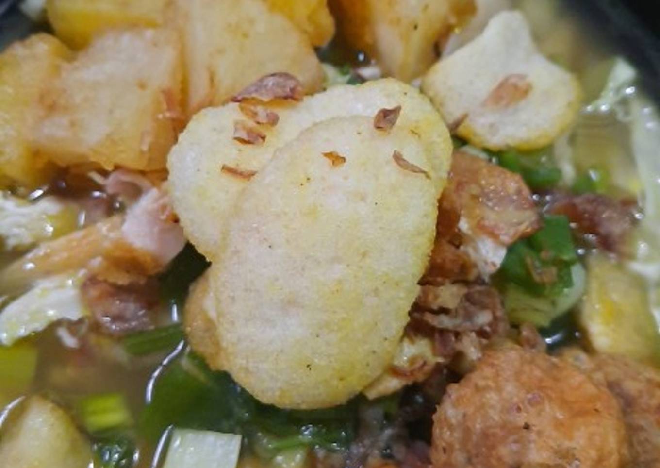 - Tata dalam mangkok berturut-turut, soun, ayam suwir, singkong goreng, perkedel kentang, daun bawang, daun seledri, bawang goreng. Siram kuahnya. Taburi bawang goreng dan beri kerupuk