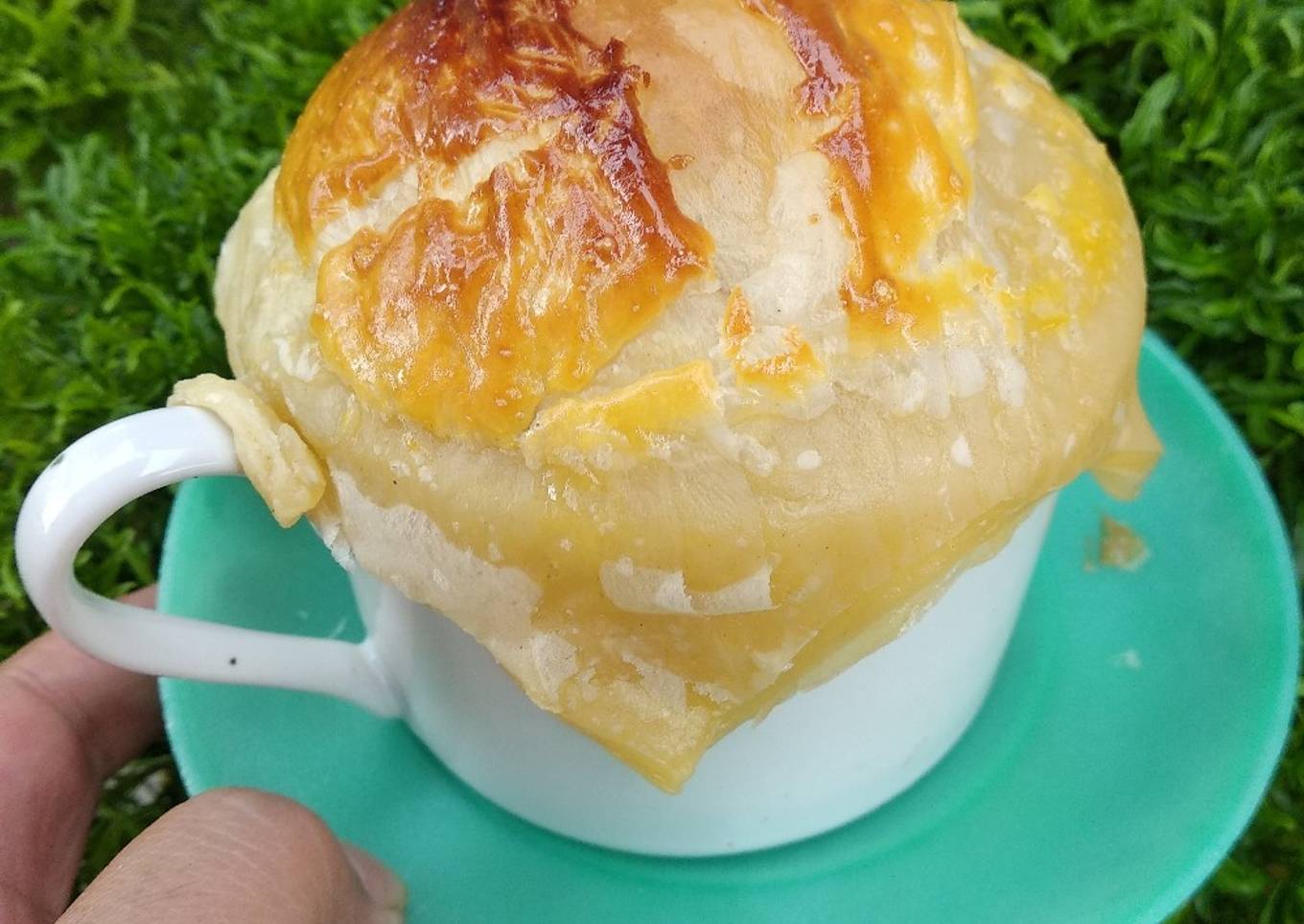 - Masukkan soup kedalam cangkir, dan tutup dengan pastry. Beri kuning telur diatas pastry, kemudian oven dengan suhu 180° selama 20 menit. Setelah matang, angkat dan sajikan selagi hangat. Bisa ditambahkan saus sambal untuk pelengkap. Selamat mencoba ya ☺️
