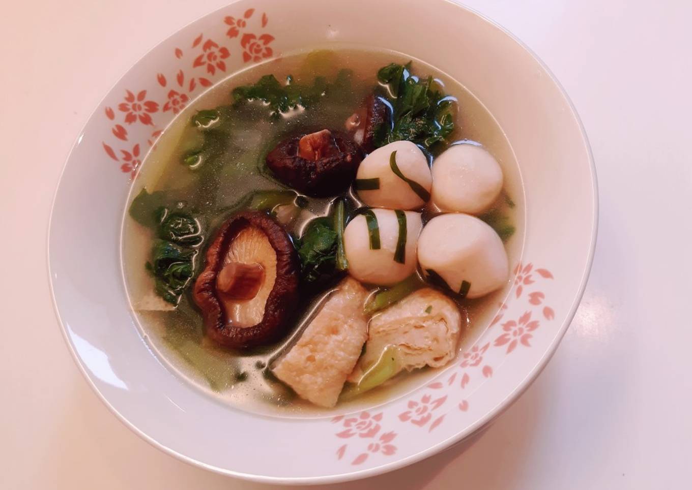 - Fishball, jamur shitake, kulit tahu, sawi ijo. (Sesuai selera)