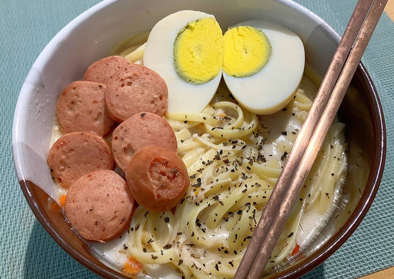 - Masukan ke mangkok dan tambahkan rebusan telur ayam dan sosis yang digoreng