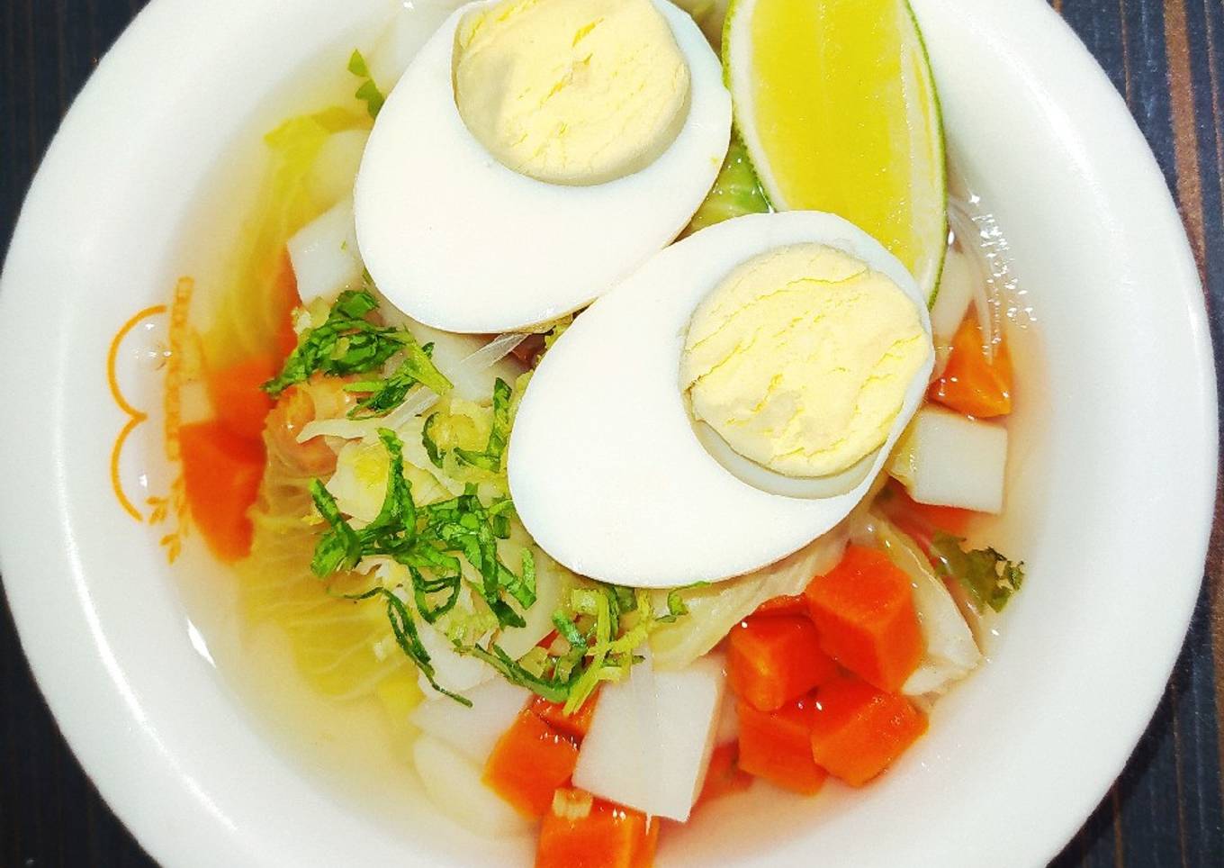 - Potong rebusan telur menjadi 2 bagian dan tambahkan di atas sup.