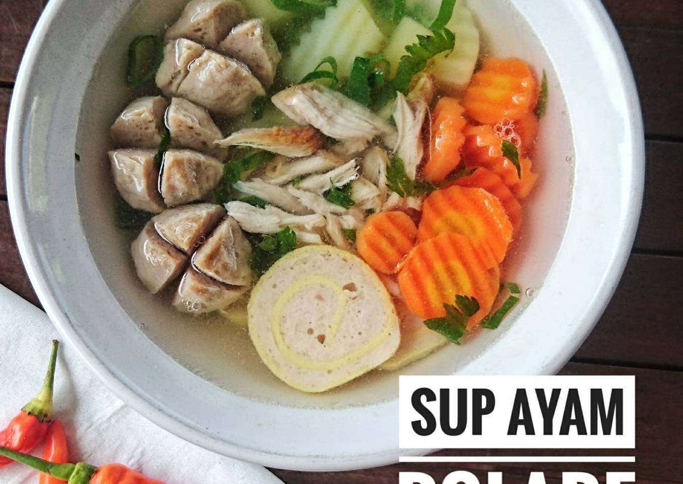 - Siapkan mangkuk, tata semua sayur, ayam suwir, dan rolade lalu tuang kuah dan bakso kedalam mangkuk. Taburi dengan loncang dan seledri iris. Hidangkan panas-panas.