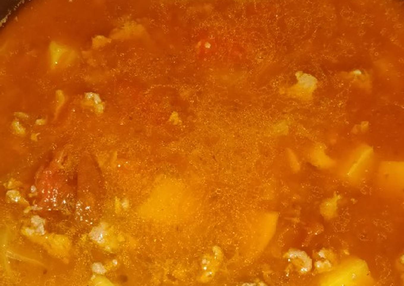 - Masukkan ayam giling, pure tomat, dan potingan tomat. Masak hingga matang