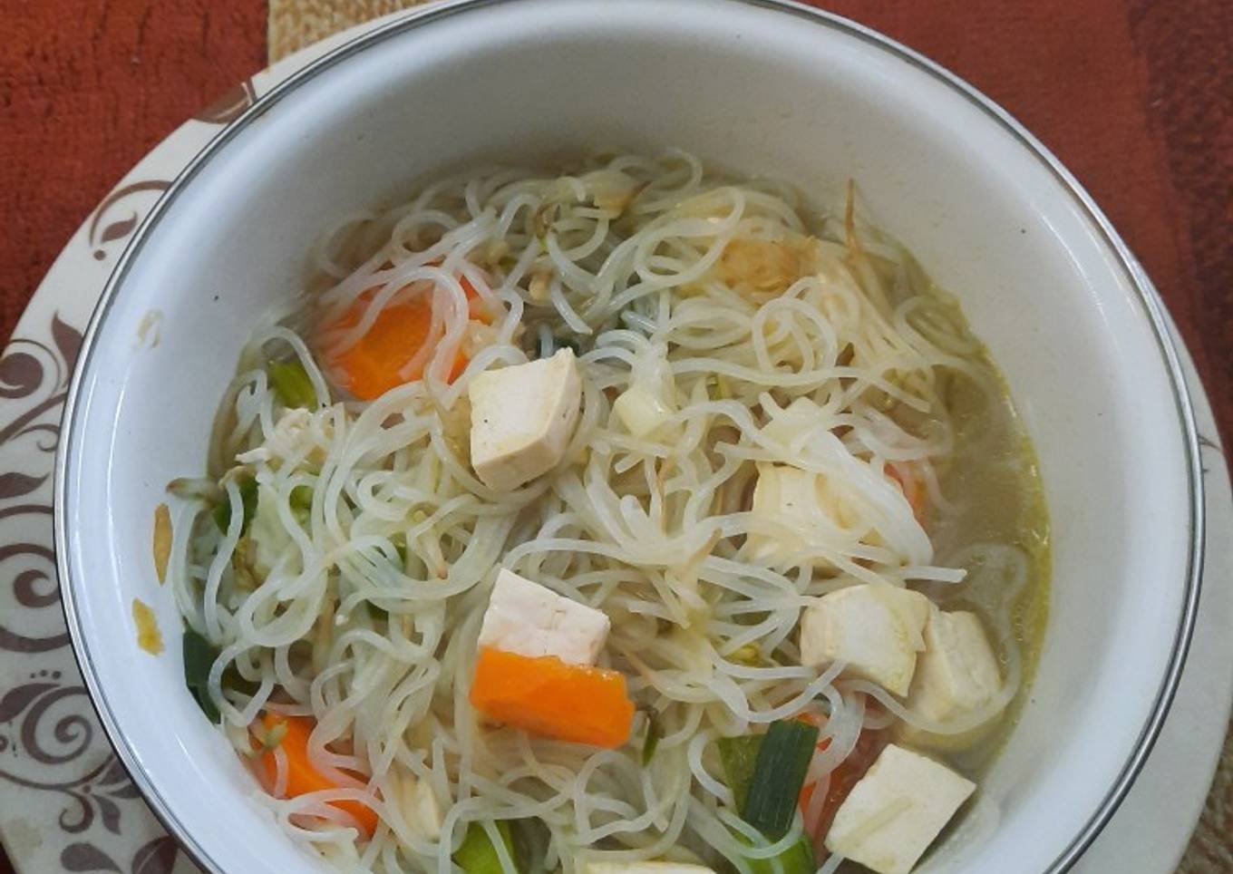 - Setelah mendidih masukkan bihun, tauge, oyong dan daun bawang hingga layu.